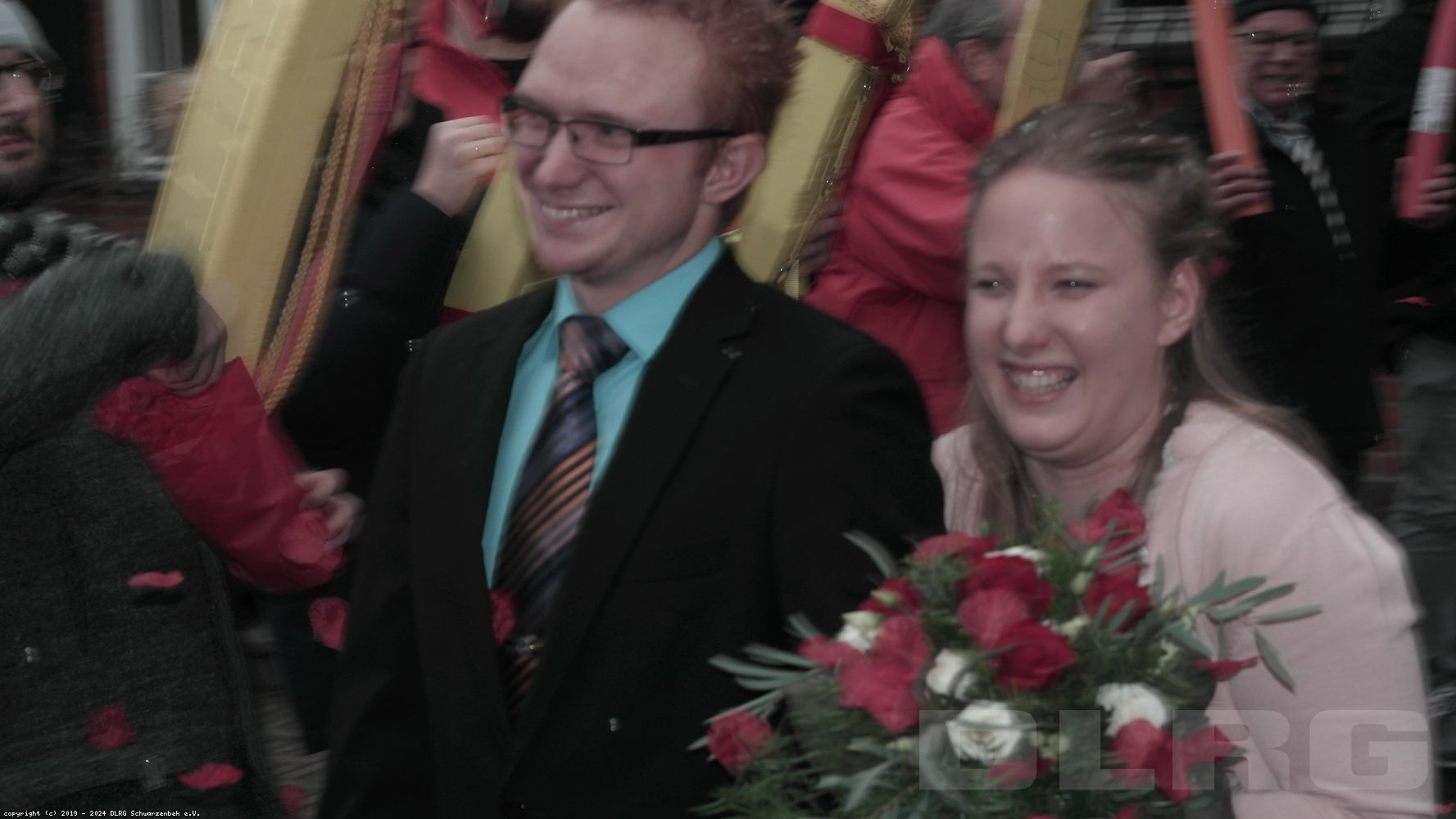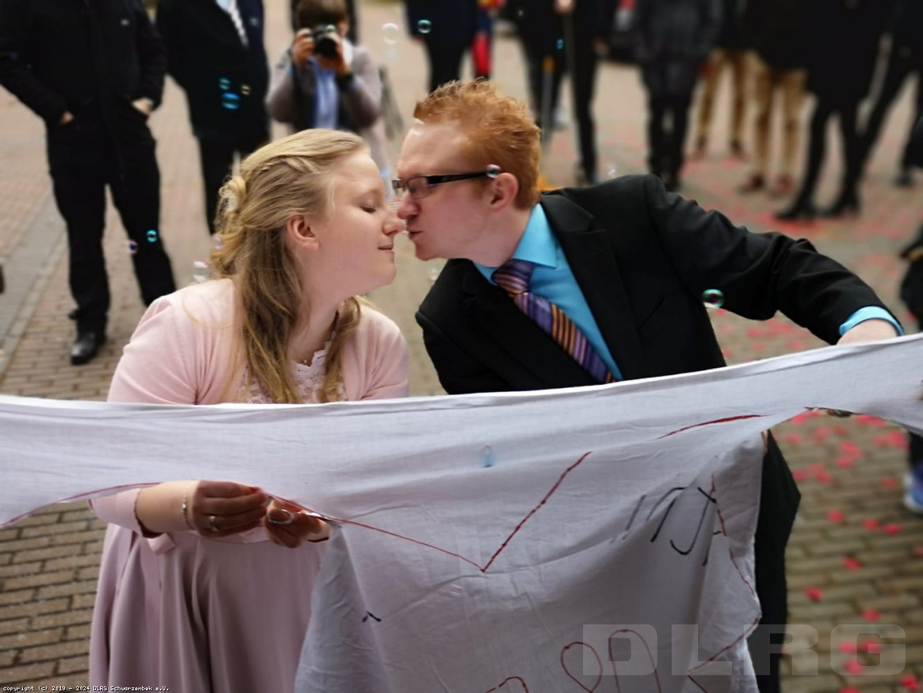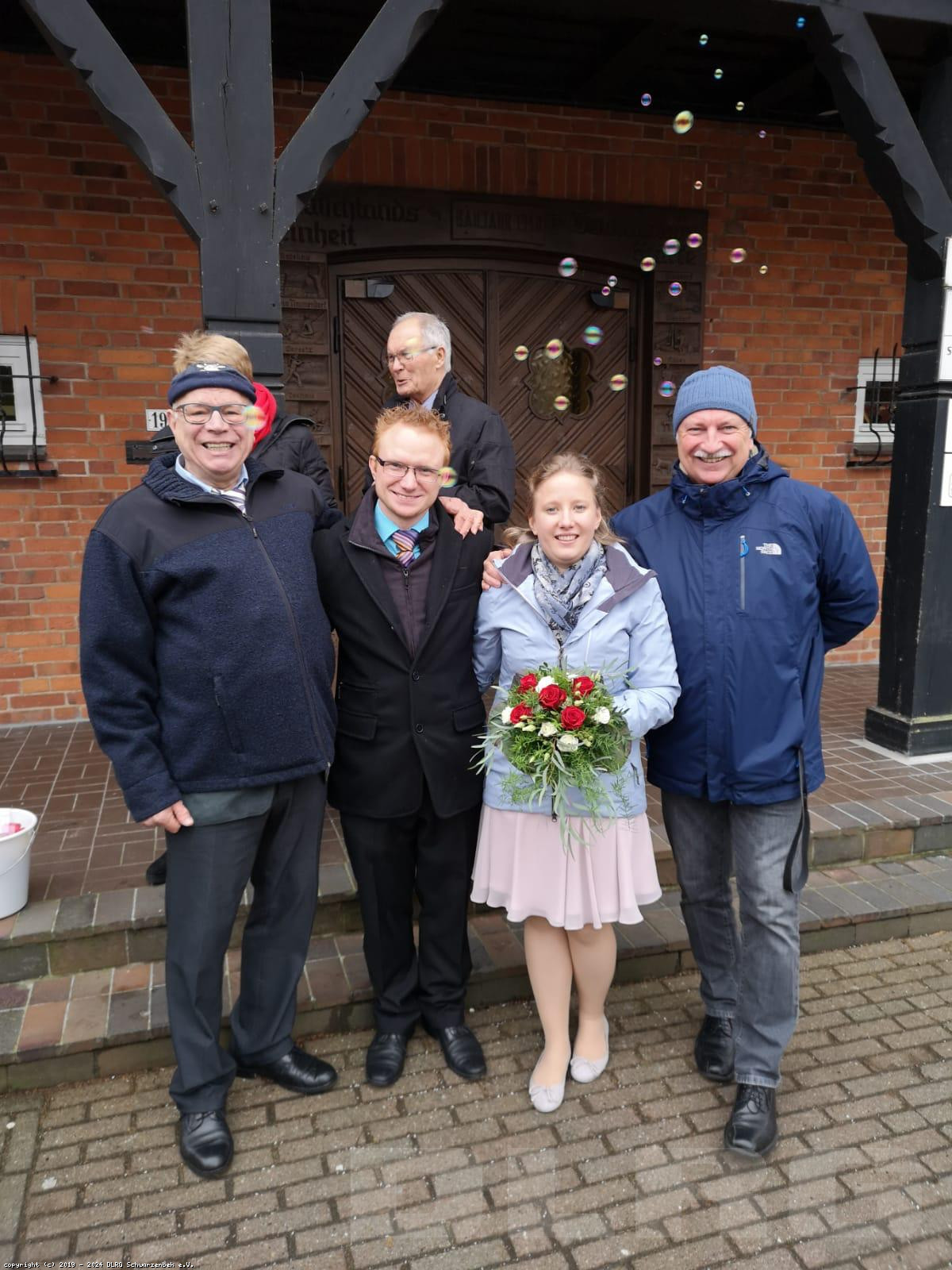 Die Überraschung ist geglückt, das junge, strahlende Brautpaar schreitet unter Reisewurf und Seifenblasen durch die Menge.
