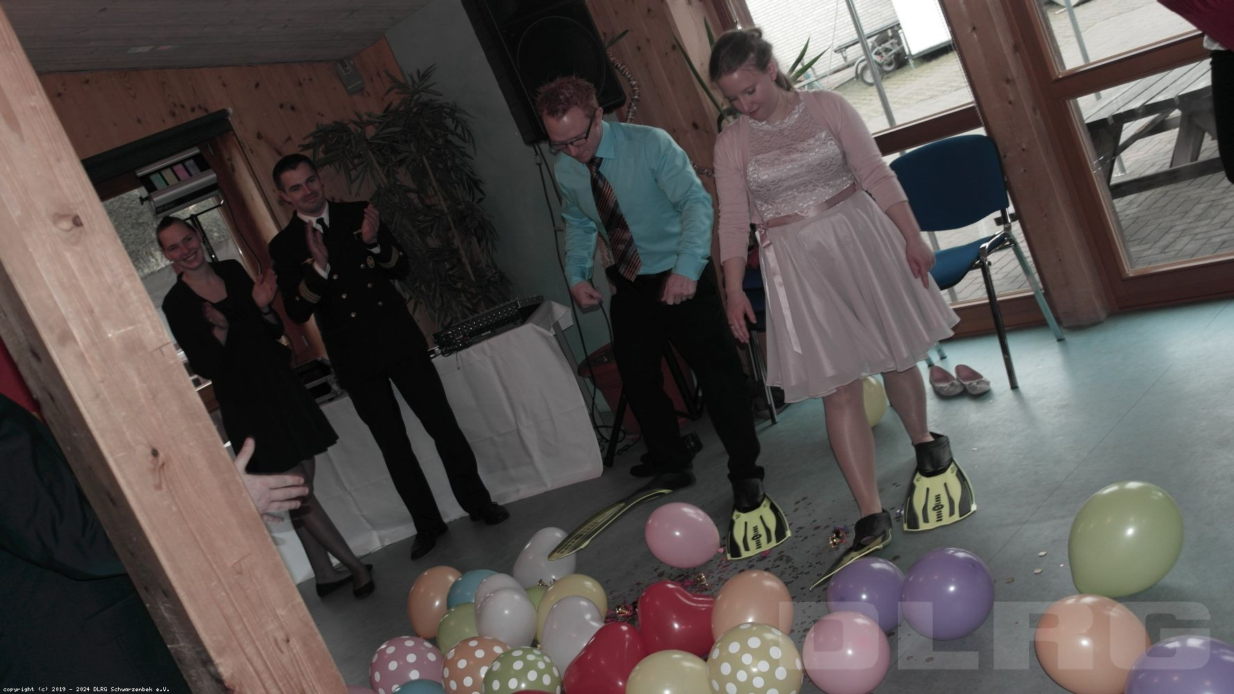 Nach dem Kuchen uns wieder eine Aufgabe an das Paar - ausgerüstet mit großzügig großen Schwimmflosse, müssen Beide Luftballons "öffnen" - ein Geldregen wartet !